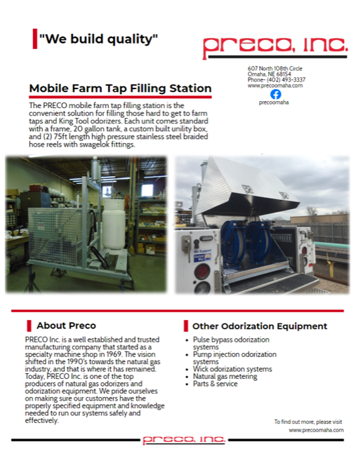 This portable unit is designed to service both farm taps and smaller King Tool odorizers. The PRECO Mobile Fill Unit easily fits in the back of a utility truck and can be removed at any point.